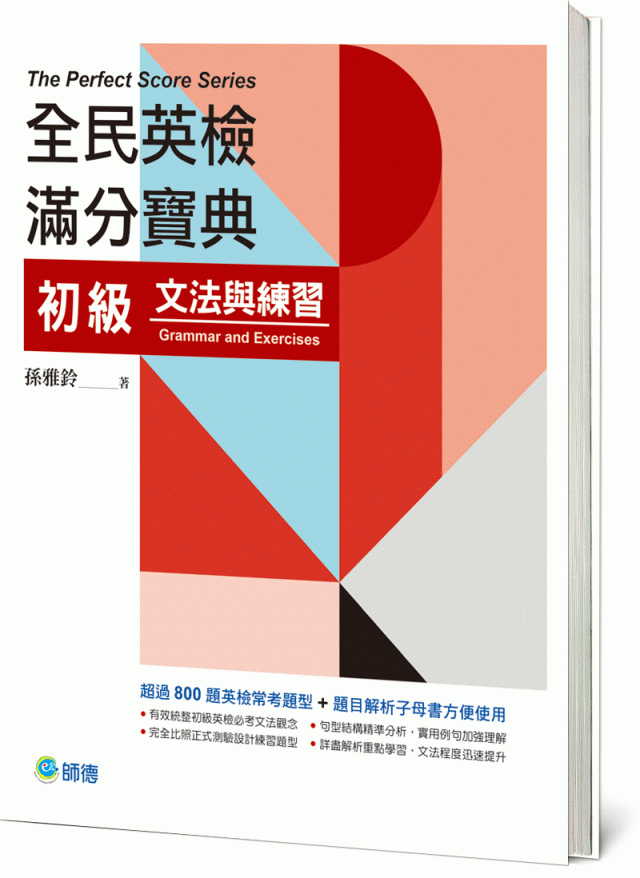 本書將初級全民英檢的閱讀與寫作能力測驗常考的文法觀念加以整理、說明,並針對初級常考題型來設計練習題。每一單元的文法說明詳盡、例句精闢,再搭配表格整理與比較,文法觀念全面掌握。單元學習後立即進行練習,即時檢驗學習成果,加強文法觀念的實際應用。另附解析本,詳細說明各題解題重點,有效提升面對英檢試題的解題能力。