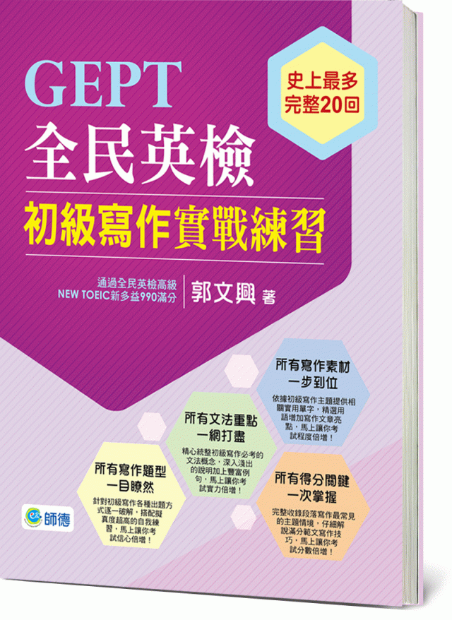補教名師郭文興老師依照全民英檢初級寫作測驗內容,分別解析單句寫作與段落寫作兩大題組,精選初級寫作必考的文法句型,搭配擬真度超高的寫作題目,完全掌握得分重點,初級寫作保證高分通過。