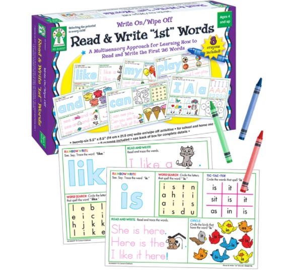 Read & Write First Words includes 26 write-on/wipe-off activities and 8 crayons.