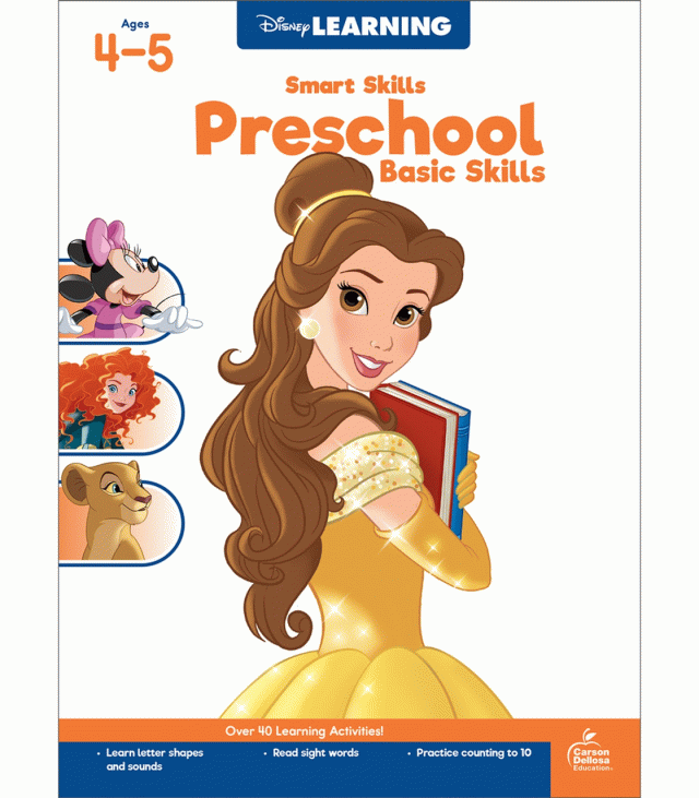 The Smart Skills: Preschool Basic Skills activity book provides hours of engaging exercises to help young learners to practice letters, sounds, shapes, patterns, counting, and more alongside their favorite Disney characters including Belle, Simba, and Mickey.