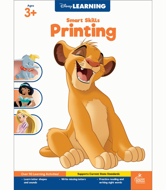 The Smart Skills: Printing activity book provides hours of engaging exercises to help young learners practice pre-handwriting skills and handwriting basics alongside their favorite Disney characters including Cinderella, Rapunzel, and Simba.